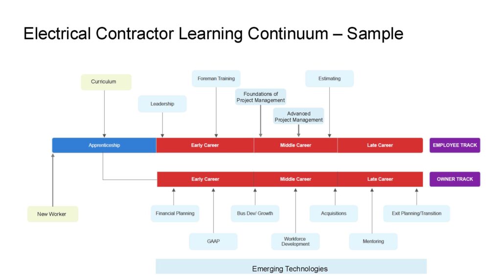 The learning curriculum plots out educational needs along the electrical contractor career continuum from apprentice to early career, middle career, late career in two tracks: employee and owner. See graphic.
