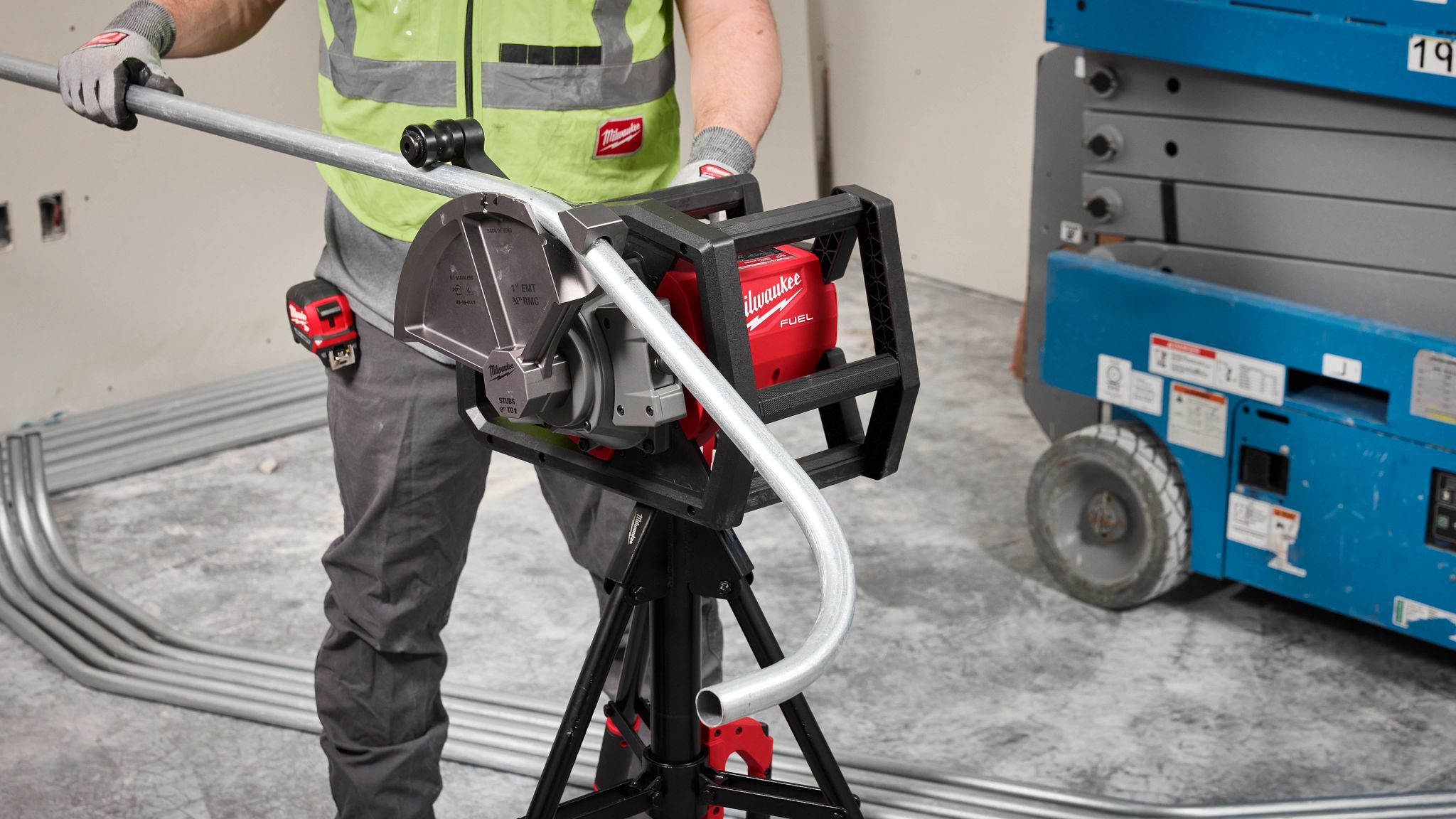 The M18 FUEL Branch Conduit Bender w/ AUTO-ZERO is the industry’s first portable cordless conduit bender, explicitly designed for commercial and industrial electricians’ branch installations. The tool’s capacity and portability are optimized for branch installations up to 1″ EMT and ¾” RMC, enabling bends to be done at the point of installation, allowing electricians to work anywhere. The M18 FUEL Branch Conduit Bender delivers the fastest bends from start to finish. The optimal working height of the tool and the shoe and backformer orientation keep critical layout points and bend planes easily visible from a single, ergonomic working position. The M18 FUEL Branch Conduit Bender takes bend consistency to another level, with AUTO-ZERO technology sensing 0º automatically on every bend, delivering unrivaled bend accuracy from pipe to pipe and over the tool’s life. These fundamental changes to the bending process revolutionize productivity for multi-raceway installations, reduce rework, and requires up to 10X less peak muscle effort in lower back muscles vs hand bending.  The POWERSTATE brushless motor and M18 REDLITHIUM batteries supply the power and runtime to bend all day with an XC5.0 Battery Pack (sold separately) delivering up to 110 bends on 3/4″ EMT Conduit. The Bender features REDLINK PLUS Intelligence, the most advanced Cordless Power tool electronics system for maximum performance.