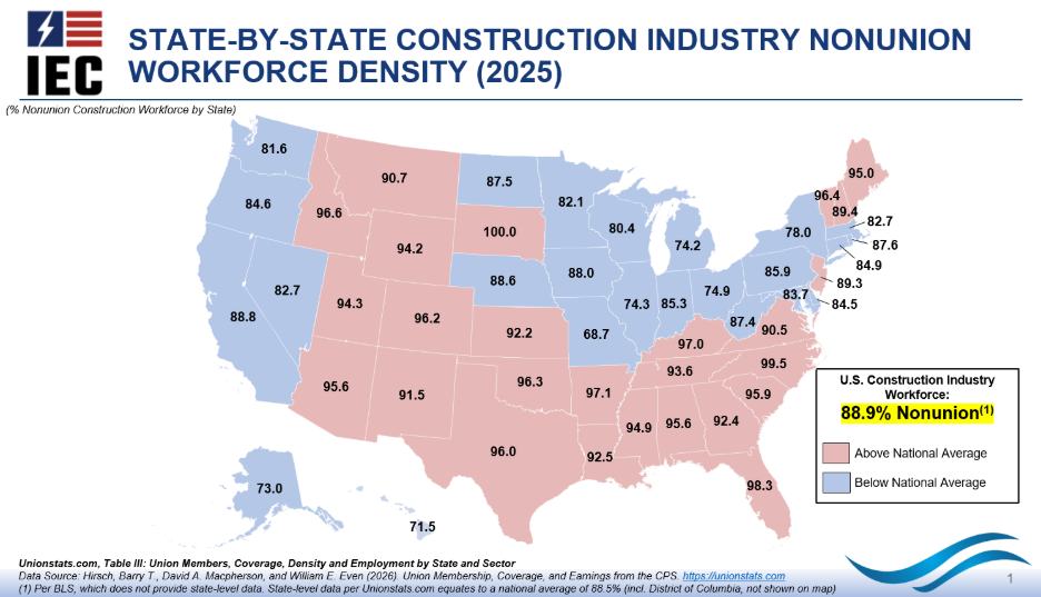 According to an IEC analysis of data from the U.S. Bureau of Labor Statistics’ 2025 Union Members Summary released February 18, the number of construction industry workers choosing not to belong to a union has reached an all-time high, underscoring the continued dominance of the merit shop employment model at a time when the industry faces significant economic and workforce challenges.